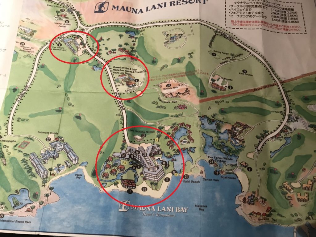 1つ目は海側のホテル。宿泊施設や人気レストラン・カヌーハウス、プールなどが1か所に揃っています。地図の真ん中にある赤円は、スパとフィットネスジム、テニスコートがあるエリアです。1番上の赤円はショップが建ち並んだエリアで、ショップやレストラン、スーパーマーケットがあります。