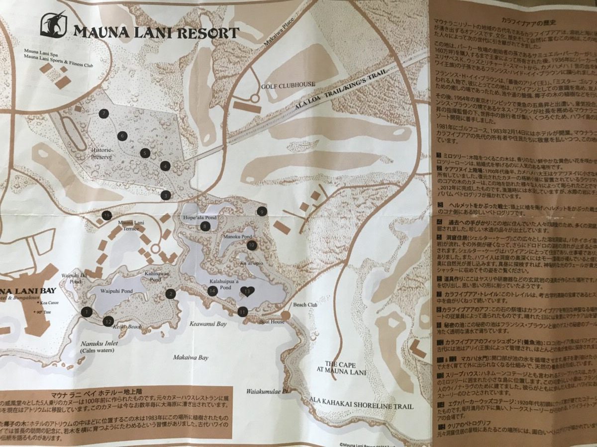 「マウナ・ラニ・ベイ・ホテル&バンガローズ」のリゾート内には、様々な歴史&パワースポットがあります。色々とありどこに行けば悩んでしまいそうですが、チェックイン時にこのような地図をもらえるので、地図を片手に散策ができます♪
