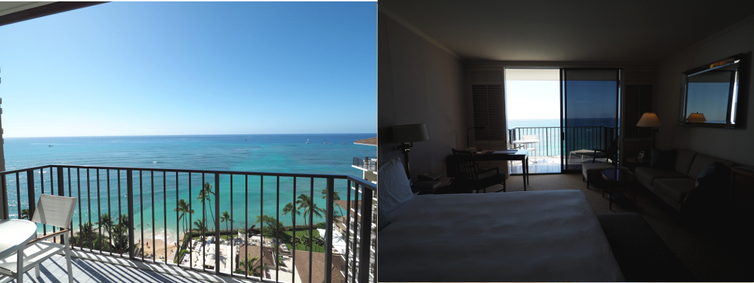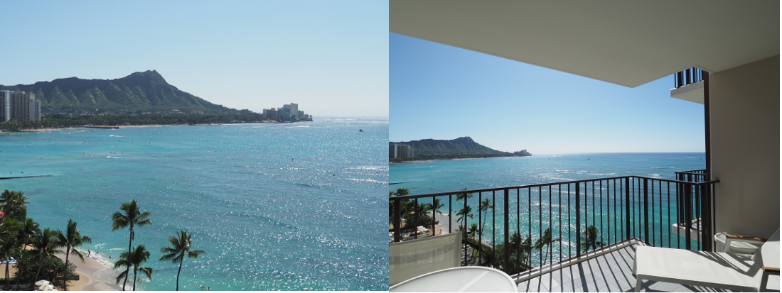 部屋の中からも、海やダイヤモンドヘッドを見渡すことができます。前を見ればハワイらしい美しい風景、下を見ればハレクラニのシンボルともいえるオーキッドがデザインされたプール...。どこを見ても絵になる部屋ですね!ハネムーンや記念日など、特別な旅行の際にぜひ泊まってみたいなと思いました。