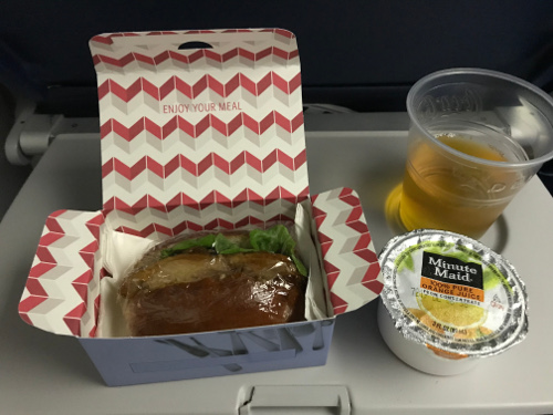 そして到着前に最後に出てきたのが、こちらのグリルテリヤキチキンサンドイッチ!タイミングとしては、朝食の時間になります。ミニッツメイドのオレンジジュースも一緒にわたされるので、柑橘系の味が口に広がり眠気がすっきりして目が覚めます。フライト全体を通してしっかりと食事が提供されるので、ハワイに着くまでお腹がすくことはありませんでした。