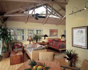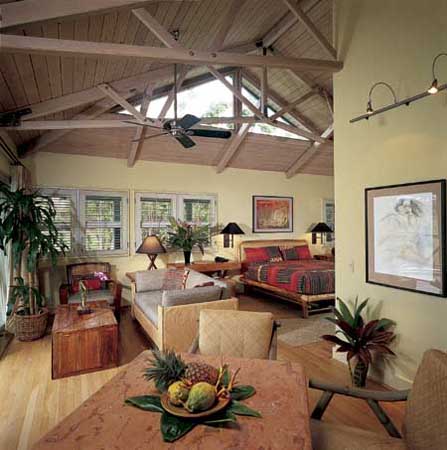 竹やラタンなど自然素材を用いたファニチャーとハワイアンキルトで調えられたコテージは、どこか懐かしさを感じる雰囲気。エアコンもテレビもなく、日常生活をすっかり忘れる自由な時間は、つい癖になってしまうほど。