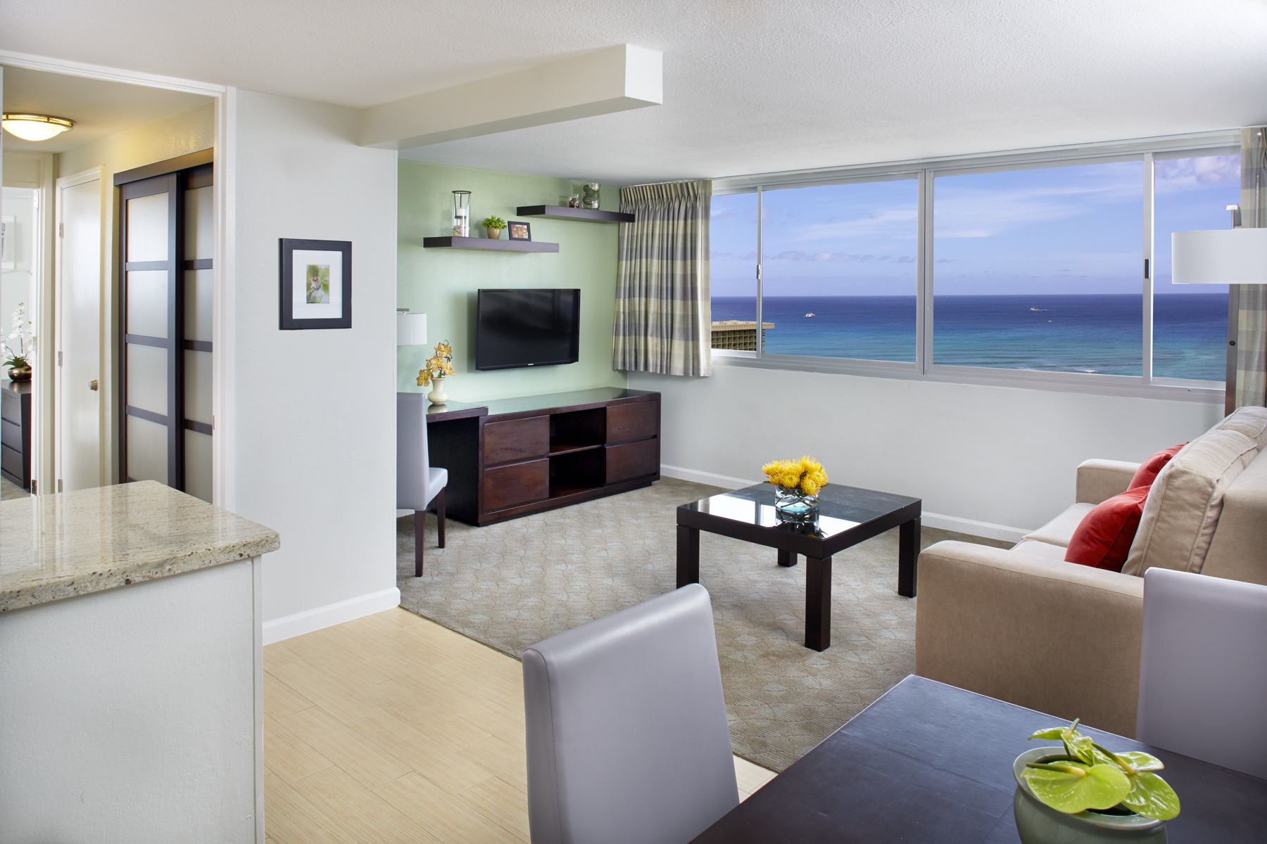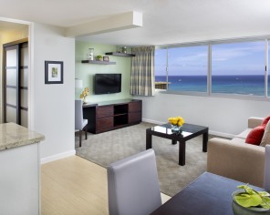 2012年に改装されたお部屋は、自然界の色彩をテーマカラーにしたモダンなインテリアで統一。キチネット付きステューディオ(29平米)とフルキッチン付き1ベッドルームスイート(53平米)があり、ミニ冷蔵庫や電子レンジ、コーヒーメーカーを完備。広々としたプライベートラナイもあるので、お好みの場所で食事を楽しめます。