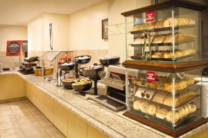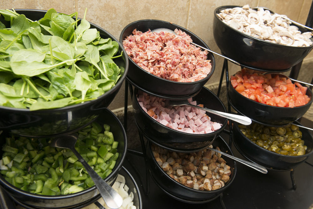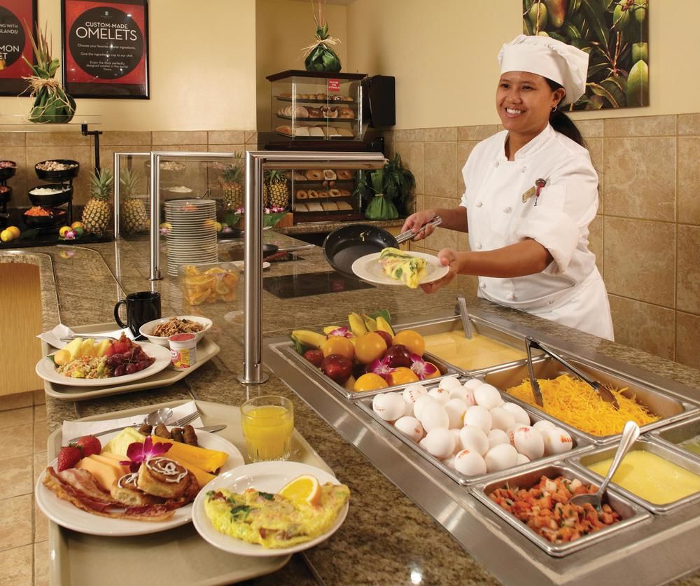 無料サービスが充実している「エンバシー・スイーツ・バイ・ヒルトン・ワイキキ・ビーチ・ウォーク」。一日のはじまりにパワーをチャージする朝食ビュッフェは、シェフが目の前で調理してくれるオムレツステーションをはじめ、洋食や和食、フルーツなどの様々なメニューが並びます。