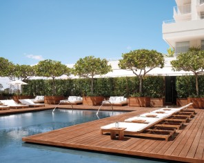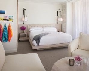 白を基調とした明るい清潔感のあるゲストルームは、イタリアンブランドのデザイン家具や上質なリネン、遊び心溢れるアメニティなどで彩られています。また、館内には2つのプールとスパも併設。緑とウッドデッキに囲まれた「サンライズ・プール」では水中スピーカーから流れる音楽が楽しめ、真っ白な砂を敷き詰めたビーチのような「サンセット・プール」では18歳以上のゲストのみが利用できる大人の時間を満喫できます。