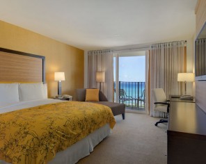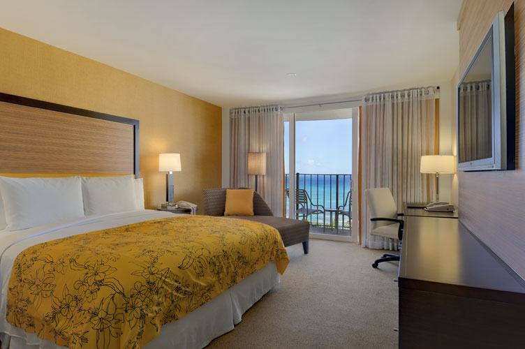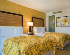 イエローがアクセントになった明るい雰囲気のお部屋は地元アーティストがデザイン。真っ青な海が輝くオーシャンビュー、稜線が美しいマウンテンビュー、夜景が楽しめるシティビューとハワイらしい景色を眺めるお部屋が様々に用意されています。リビングルームを備えた1ベッドルームスイートもあります。