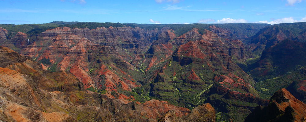 長さ22㎞、幅2㎞、深さ1,097m以上──数百万年という長い年月をかけて、雨や川が創り上げた迫力ある自然の造形美、ワイメア渓谷。この深く美しい渓谷は「ワイメア・キャニオン・ルックアウト(展望台)」から見渡すことができます。