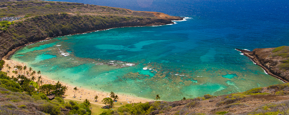オアフ島随一のシュノーケリングスポットとして知られるハナウマ湾。かつて火山の火口だった場所は波の浸食がなだらかな入り江を形成。現在は多くの熱帯魚やウミガメが遊ぶ穏やかなリーフとなりました。