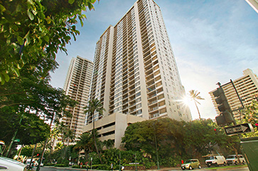 ワイキキ中心のビーチからほんの2ブロックに位置し、すべての客室は1ベッドルームで、ご家族連れに最適です。全室、フルキッチン完備で、ラナイ(ベランダ)があります。