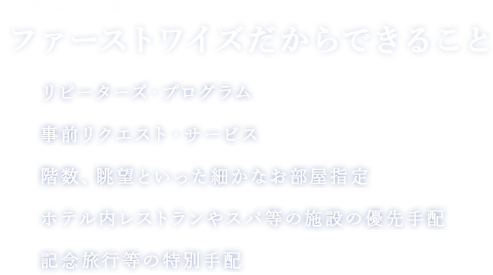 リピーターズ・プログラムリピーター様限定で前回ご利用頂いた内容を元に、同じお部屋へのご宿泊といった、お客様の好みに合わせたご宿泊内容を優先手配いたします。