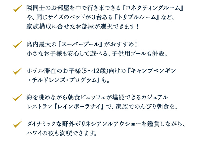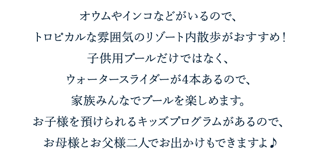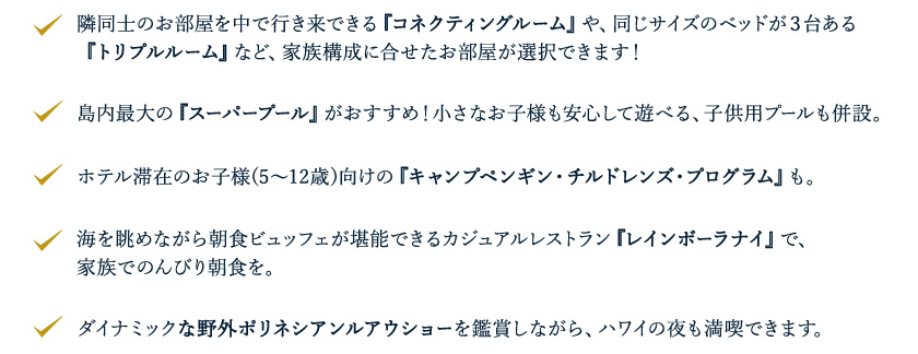個性豊かな大小のプールや、ワイキキNO.1の長さを誇るウォータースライダーなど設備が充実しています。