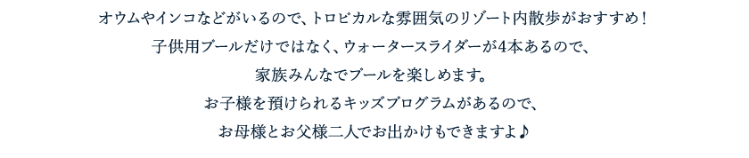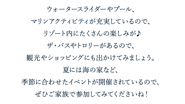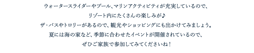 ペダルボート、カヤック、ラグーン内で使える浮輪レンタルやブギーボードなど、お子様がよろこぶアクティビティがいっぱい。