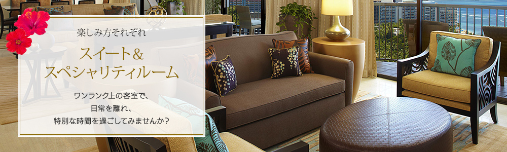 広がる贅沢空間、憧れのスイート&スペシャリティルームは、色々なご要望に合わせた客室をご提供しています。ロマンチックな休暇を演出する角部屋オーシャンフロント、家族やグループのための大きな間取り、豪華なプレジデンシャルスイート等々。あなたにぴったりのお部屋で最高の時間をお過ごしください。