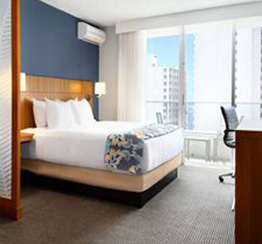 ワイキキ・ビーチ・ウォークに直結した「エンバシー・スイーツ・バイ・ヒルトン・ワイキキ・ビーチ・ウォーク」。すべての部屋がスイートタイプとなっており、ゆったり寛げます。朝食ビュッフェやプールサイドレセプションなど、無料のサービスが充実。