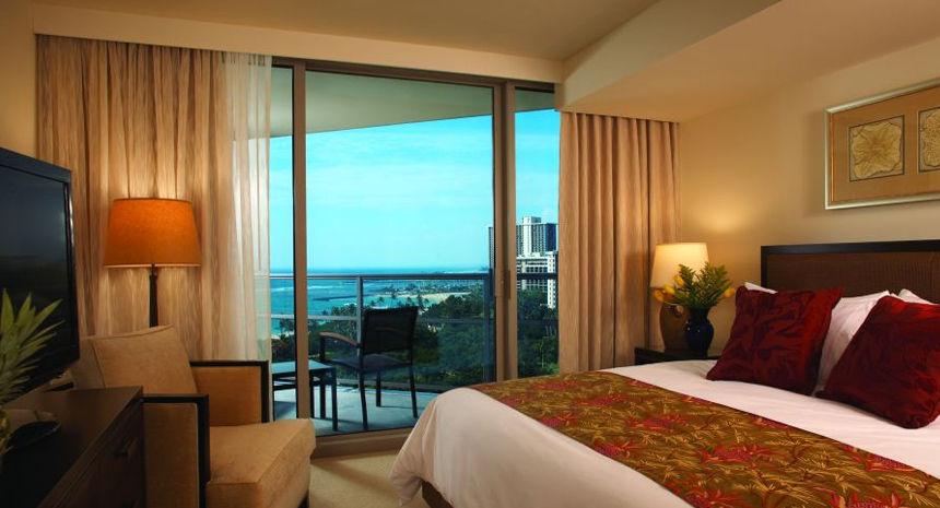 青々としたワイキキのパーシャル・オーシャン・ビューを望むお部屋です。ハワイらしい雰囲気を取り入れたコンテンポラリーなデザインになっています。