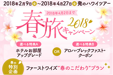 皆様 いつもスタッフ厳選トピックスをご覧下さりありがとうございます。 さて、今日は新キャンペーンのご案内です! その名もズバリ!「春旅キャンペーン2018」です! 2018年2月9日(金)発〜2018年4月27日(金)発が対象で、復活した初夢の人気2大特典に加え、ハワイ旅行専門店が本気でお部屋にこだわった“春のこだわりプラン”も特別にご用意しております! そして、このトピックスでは2大特典対象プラン、“春のこだわりプラン”からそれぞれ一つづつ厳選してご紹介いたします! ↓それでは、早速「◎春旅キャンペーン◎開催中!人気特典復活でハワイ旅行に彩りを♪」をお楽しみ下さい♪