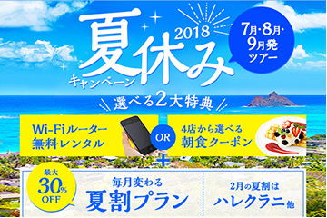 ハワイ旅行専門店が贈る2018年夏企画は、毎月変わる夏割プランとWi-Fiルーターレンタルor朝食クーポンの選べる特典で皆様をおもてなし致します♪