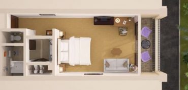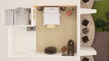 レインボー・タワーにある約29㎡のラグーン/オーシャンビュールーム。レインボー・タワーはデューク・カハナモク・ビーチとラグーンの目前に建つビーチフロントタワーで、真っ青な海とワイキキの美しい海岸線をご堪能いただけます。 キングサイズのベッドが1台設置された客室にラナイ(屋外バルコニー)を備えており、快適な椅子に腰をおろして夕陽の絶景とハワイのトロピカルな気候を満喫していただけます。モダンなインテリアのこの客室では、ヒルトンのラグジュアリーなSerenity Dream Bed & Bathコレクションをご利用いただけます。客室間取図