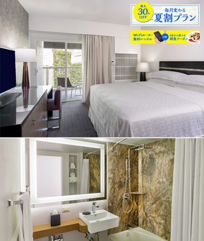カイウラニ・ウィングの後方に位置するこのお部屋は、2017年に改装されより快適に生まれ変わりました。眺望は遮られておりますが(海やプールはご覧いただけません)、プライベート・ラナイ(バルコニー)をお楽しみいただけます。ウィンドウは二重サッシとなっており、静かにお休みいただける環境です。また、バスルームにはライト付きミラーやレインシャワーとハンドシャワーを両方装備し便利にご利用いただけます。 ベッドはキングベッド1台、またはダブルベッド2台(シェラトン・シグネチャー・ベッド)となります。大人2名様はもちろんのこと、子供2名様も含めたご家族でのご利用にも、ちょうど良い広さのお部屋です。エキストラベッド、ベビーベッドは入れることができません。(面積約21平方メートル)
