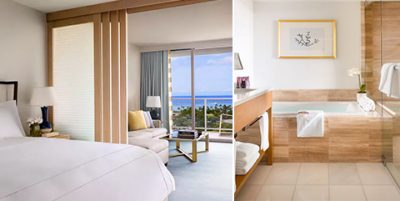 もちろんそれだけではありませんよ♪ご宿泊頂くお部屋もこだわっています!「1ベッドルーム・デラックス・オーシャンビュー・スイート」という、デラックスレベルの中では最高のお部屋で、余裕のある約58平米の室内、最上級の家具や機器、様々なラグジュアリー・サービスで充実したホテル・ライフをお過ごしいただけると思いますよ♪