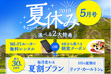 - 選べる夏特典 “4店から選べる朝食クーポン”か“Wi-Fiルーターレンタル”のどちらかお好きな方をプレゼント