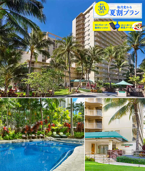 夏割プランから最初のご案内は、フレンドリーなホスピタリティーと緑の植栽に囲まれて落ち着いた雰囲気がご家族の皆様にも人気の「コートヤード・バイ・マリオット・ワイキキ・ビーチ」から、繁忙期の夏でも比較的ご利用頂きやすい価格帯の“シンプルプラン”をチョイス!