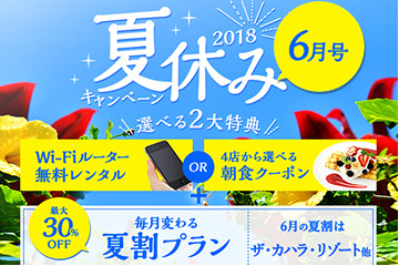 - 選べる夏特典 “4店から選べる朝食クーポン”か“Wi-Fiルーターレンタル”のどちらかお好きな方をプレゼント