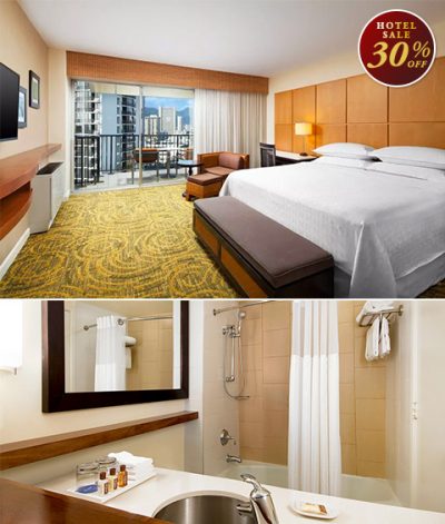 低層階に位置するシティービューのお部屋では、ワイキキの夜景を見渡すことができます。 スタイリッシュなゲストルームには、バルコニー、キングベッド1台またはダブルベッド2台(シェラトン・シグネチャー・ベッド)、事務机、ワイヤレスインターネット接続(Wifi)、留守録機能付き電話、ワイドスクリーンの薄型液晶TV、ケーブル・チャンネル、室内セーフティーボックス、コーヒーメーカー、エアコン、バス用品一式がついています。お部屋の広さは約26~28平方メートルです。- このハワイツアーの概要 -