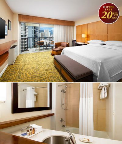 低層階に位置するシティービューのお部屋では、ワイキキの夜景を見渡すことができます。 スタイリッシュなゲストルームには、バルコニー、キングベッド1台またはダブルベッド2台(シェラトン・シグネチャー・ベッド)、事務机、ワイヤレスインターネット接続(Wifi)、留守録機能付き電話、ワイドスクリーンの薄型液晶TV、ケーブル・チャンネル、室内セーフティーボックス、コーヒーメーカー、エアコン、バス用品一式がついています。お部屋の広さは約26~28平方メートルです。- このハワイツアーの概要 -