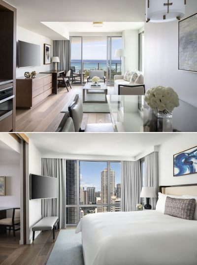 お部屋にはキングサイズのベッドのほか、リビングエリアにフルサイズのソファベッドが用意されています。2つの洗面台・バスタブ・個室シャワー・最新のウォシュレット付きトイレが備わったバスルーム、高級家電の整ったキチネットがあり、ハワイ滞在を優雅に演出してくれます。