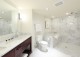 深めのバスタブを備えたイタリア製大理石のバスルーム、ダブル・シンクの洗面台、